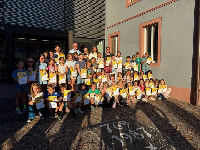Bei der Abschlussveranstaltung begrüßte Bürgermeister Dieter Schneckenburger die etwa 55 anwesenden Kinder und Teens im Foyer des Rathauses und beglückwünschte sie zu ihren tollen Leseerlebnissen. Dann überreichte er allen, die mindestens ein Buch gelesen hatten, eine Teilnahmeurkunde und eine kleine Überraschung.