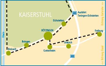 Mit den ÖPNV erreichen Sie Bötzingen mit der Linie S10/S11 der Breisgau S-Bahn. Informationen zum Fahrplan finden Sie unter https://www.bwegt.de/